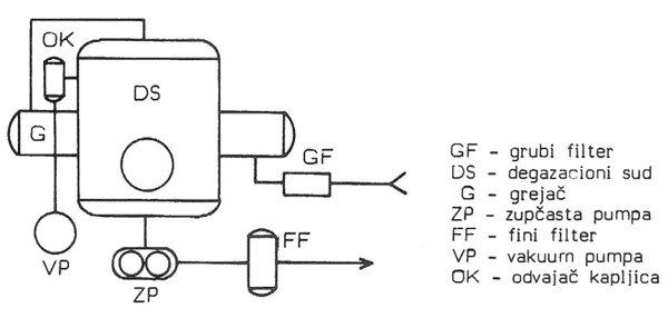 Ulje se direktno uzima iz transformatora, prolazi kroz grubi filter sa snažnim magnetom. Zatim se blago zagreva u elektro grejacu. U degazacionom sudu, koji se nalazi pod vakuumom, ulje se raspršuje ili prevodi preko specijalnih razvodnih limova i kolona koje u zavisnosti od tipa mašine imaju keramicke ispune, i oslobada se vlage i rastvorenih gasova. Na kraju procesa ulje prolazi kroz fini filter kojim se finalno odstranjuju i najsitnije mehanicke necistoce.