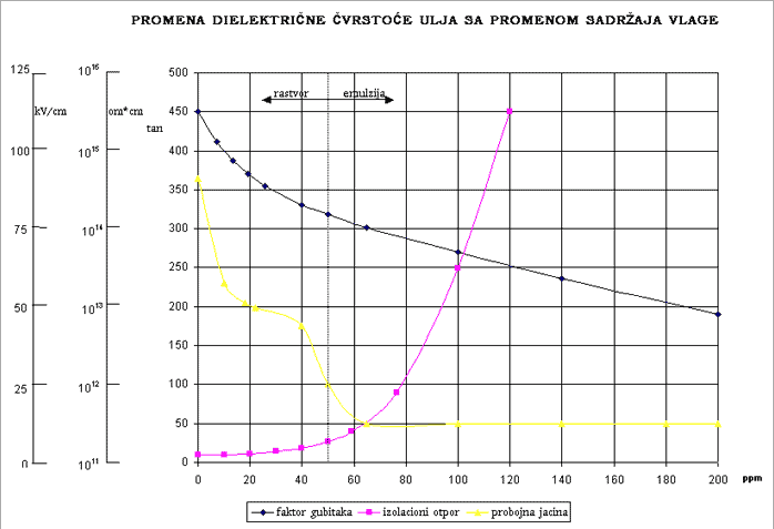 Na grafikonu koji je prikazan na sledecoj strani date su vrednosti dielektrice probojnosti, vrednosti tangens delta i izolacionog otpora u zavisnosti od sadžaja vlage u ulju u ppm.
